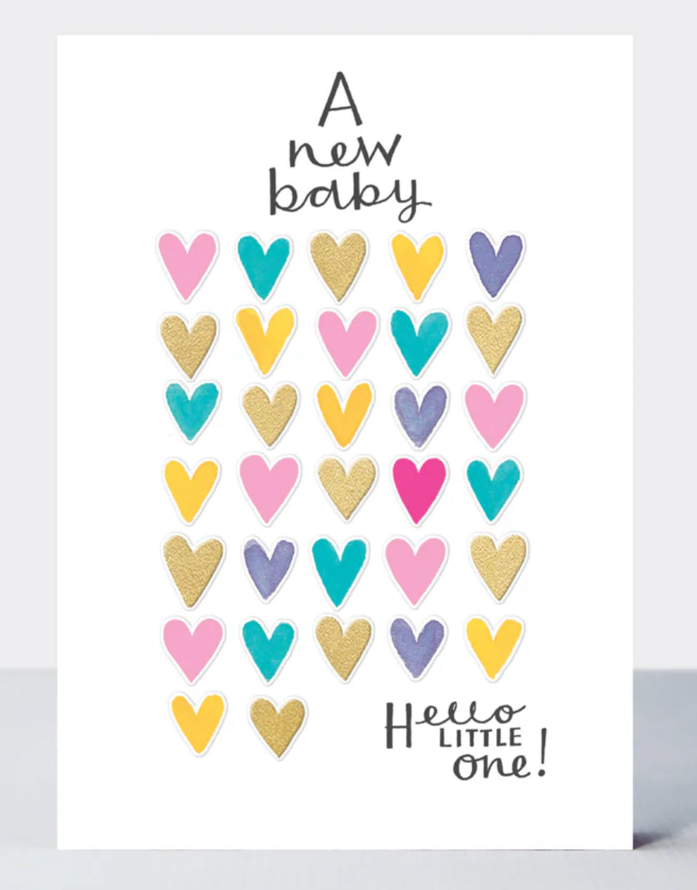 A striking contemporary New Baby card focussing on combining graphic artwork with embossing effects, gold foil and neon inks. This card is printed on textured board and supplied with a bespoke printed envelope.