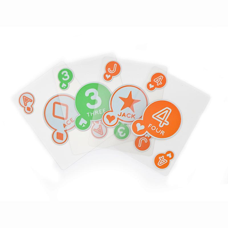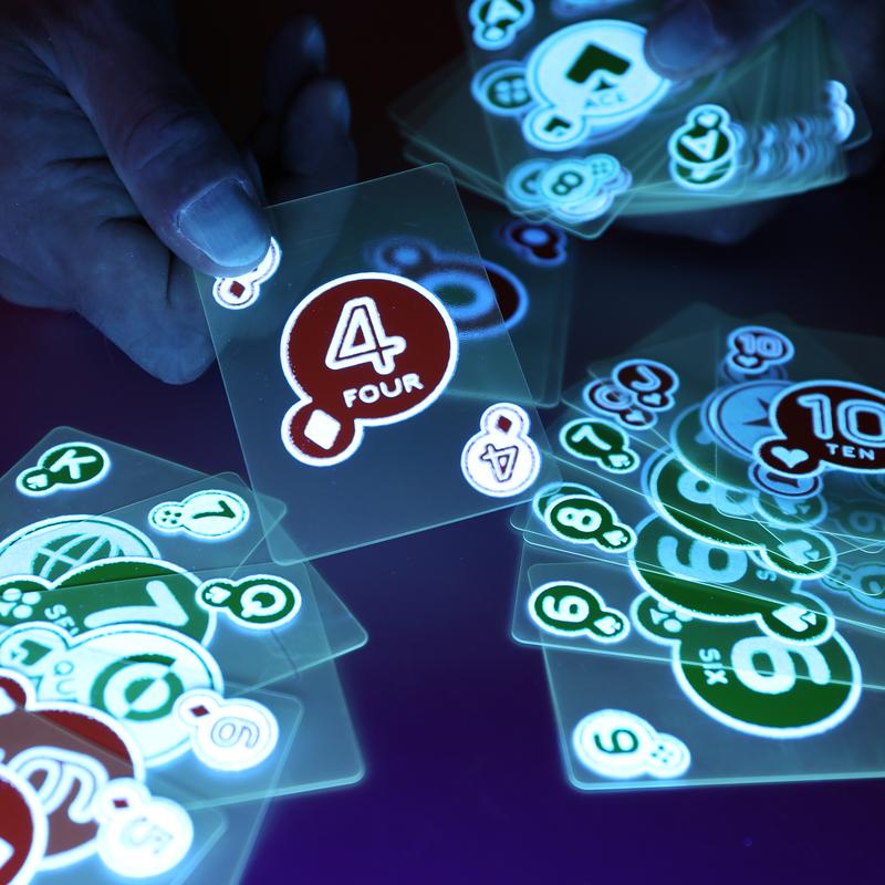 Fun visual effect transparent PVC playing cards. Place near light to charge. Glow lasts 2 hours per charge.