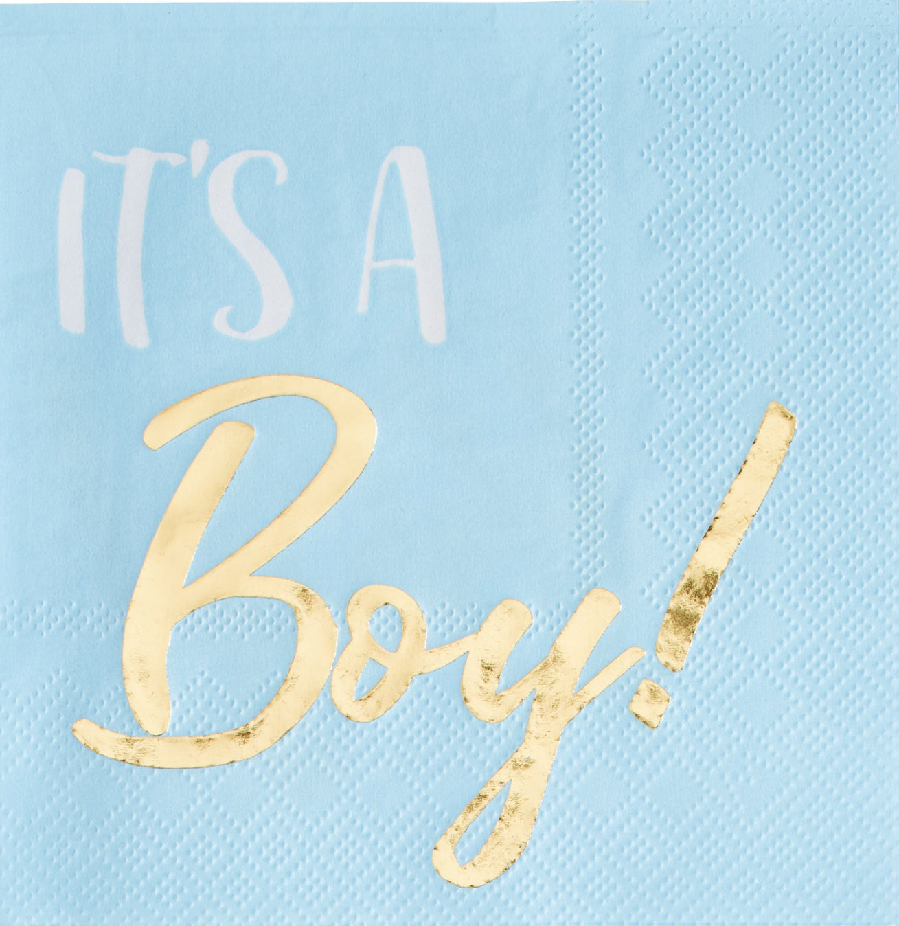 These beverage napkins are perfect for keeping your guests clean while enjoying refreshments at a baby shower. The blue-ombre design with white It's A and metallic gold Boy! text coordinates nicely with any blue party decor while the shine of the metallic gold adds some glam. At just five inches square, these compact napkins will tuck neatly into favor bags to complement other tabletop shower supplies.