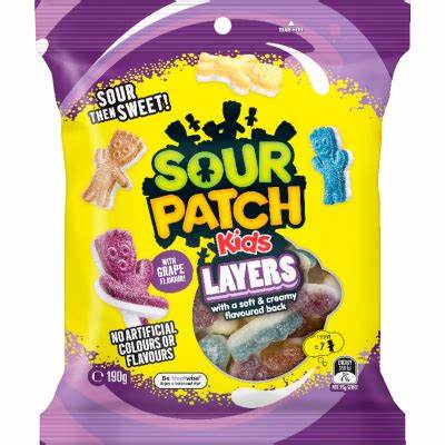 Disrupt your tastebuds on a sour then sweet journey with a creamy twist, Sour Patch Kids LAYERS! A delicious mix of delicious Sour Patch Kids jellies with a soft and creamy flavoured layer, covered in a sour then sweet blast.