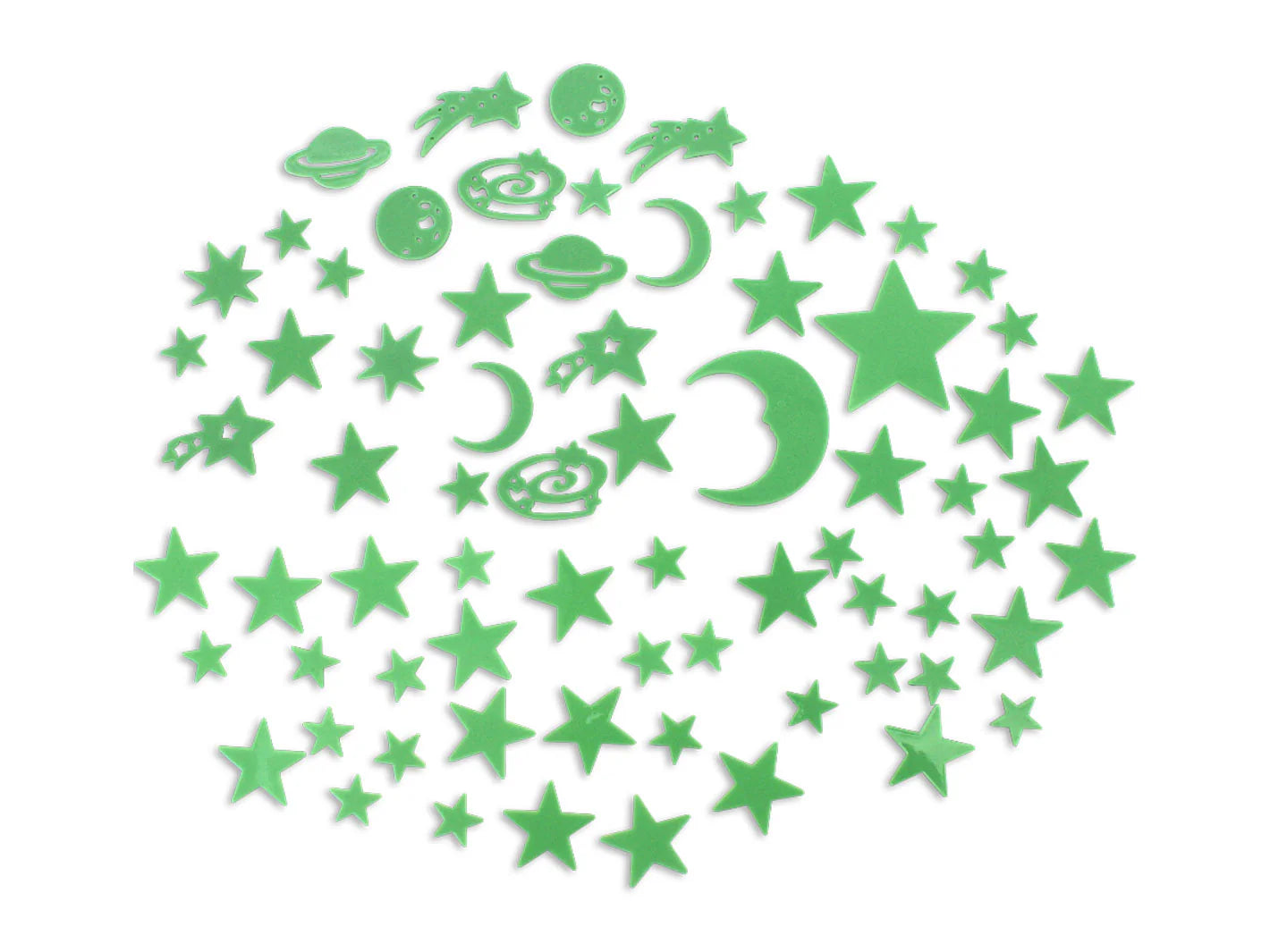 Choose from three different collections, moon and stars, stars, or galaxy. Each pack contains 24 shapes and removable adhesive dots for easy application.