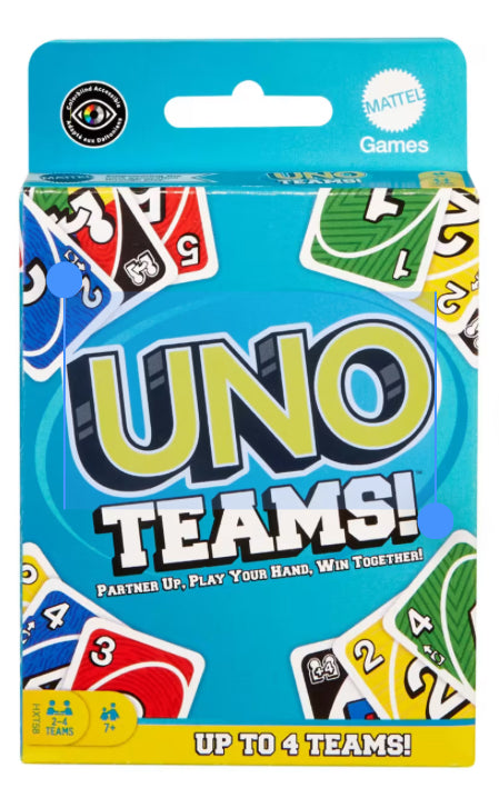 UNO Teams is a new way to play the classic game! Players still match color, number and symbol but instead of every-man-for-himself, they team up in pairs of two and play together to win. Special cards and rules help teammates work together, but both players must get rid of all the cards in their hands to win. And remember, when you (or your partner!) are down to your last card, don't forget to yell 'UNO!'